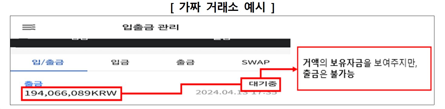 - 단체 채팅방을 통해 접속한 가짜 가상자산거래소에서 거액의 가상자산이 예치되어 있는 것처럼 화면 제공(출금은 불가)