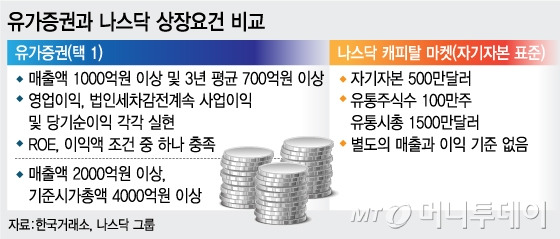 - 한국 시장에서는 최소 10억 원의 매출과 3년 평균 7억 원의 매출을 요구하는 반면, 나스닥은 최소 50만 달러의 자본을 요구해요.