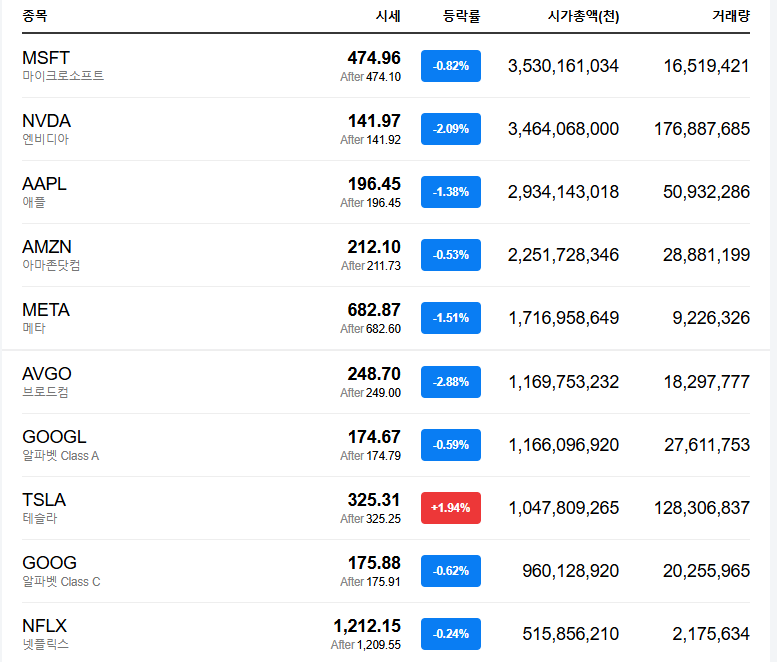 - 메타(-1.51%)와 MS(-0.82%)도 하락