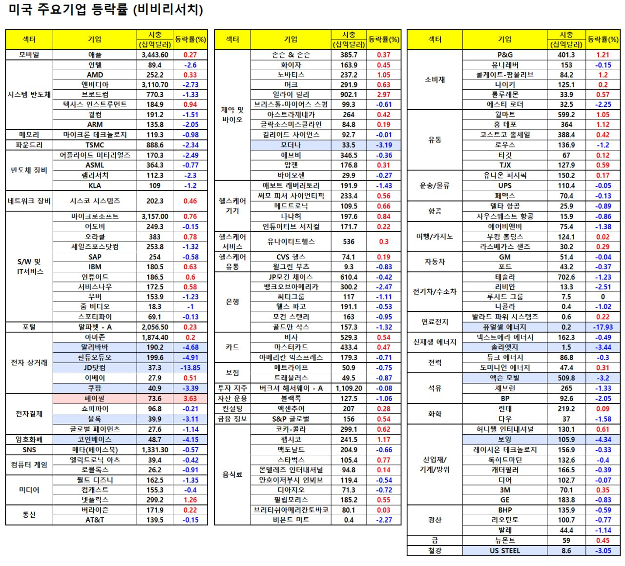 - 엑슨모빌(-3.33%), 셰브론(-1.46%) 등 에너지 업종은 중동 불안 완화 기대와 트럼프 트레이드 완화 여파로 하락.
