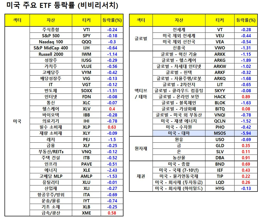 - 브로드컴(-1.05%), 마이크론(-0.59%) 등은 하락. 이에 필라델피아 반도체 지수는 1.33% 하락