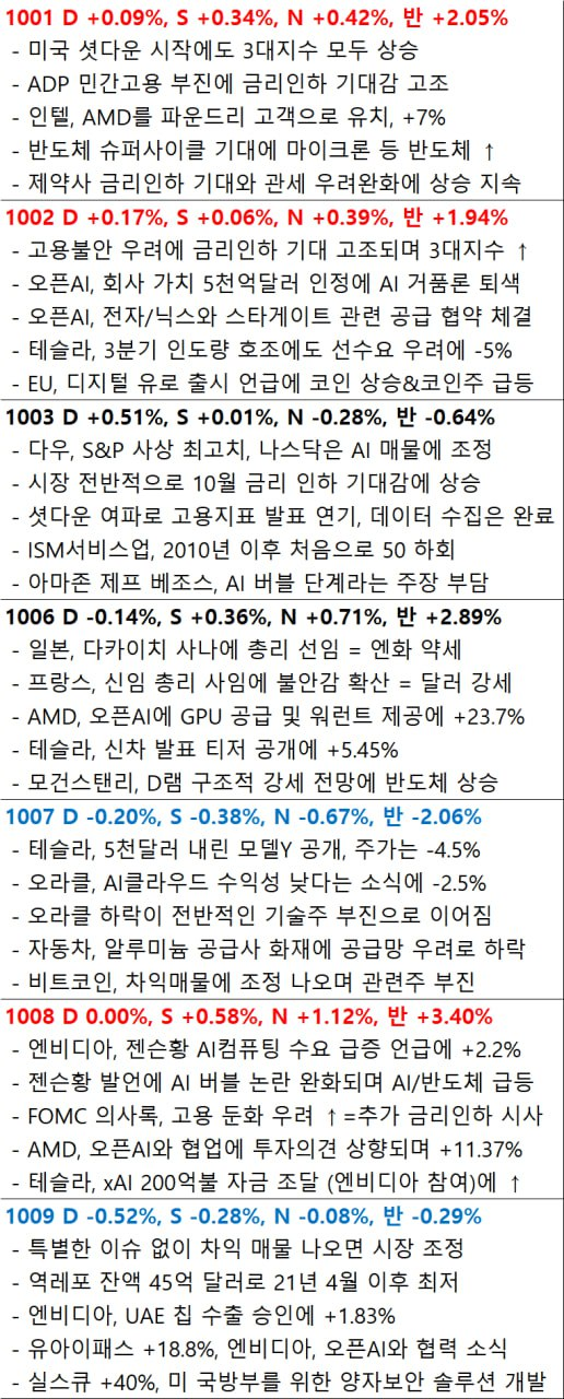 - ▫️미 연방정부의 셧다운이 계속되면서 시장에 공개되는 경제 데이터가 제한되고 있습니다.