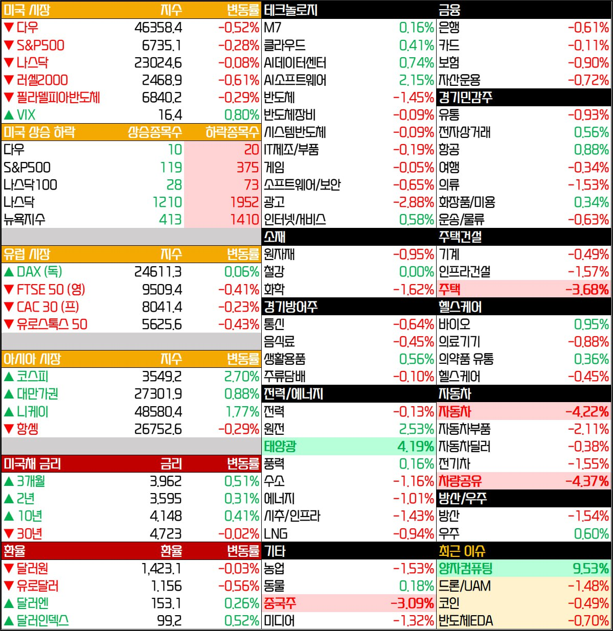 - 기술주에서는 엔비디아가 애널리스트들의 목표가 상향과 함께 UAE 반도체 거래 승인 소식이 전해지며 1.73% 상승했습니다