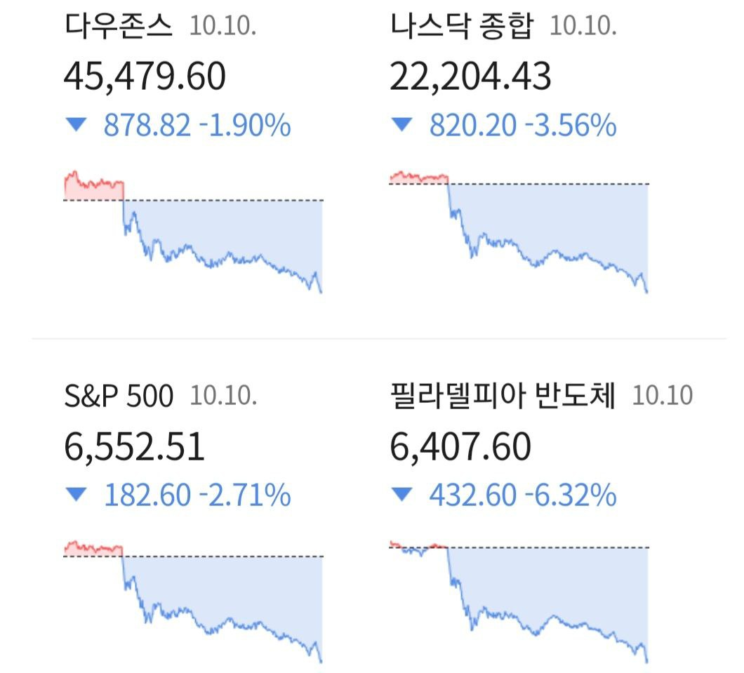- 어제 하락 후 시장은 상승 출발. 그러나 중국 희토류 수출 통제 강화에 대응해 트럼프가 관세 대폭 인하, 시진핑과의 정상회담 취소 등을 언급하자 시장은 하락 전환 후 장마감까지 낙폭 지속 확대. 큰 이슈가 없으면 디폴트로 상승만 해오던 시장이 오랫만에 3대 지수 -1% 이상, 나스닥은 -3% 이상 하락하는 피바다 떡락장 시전