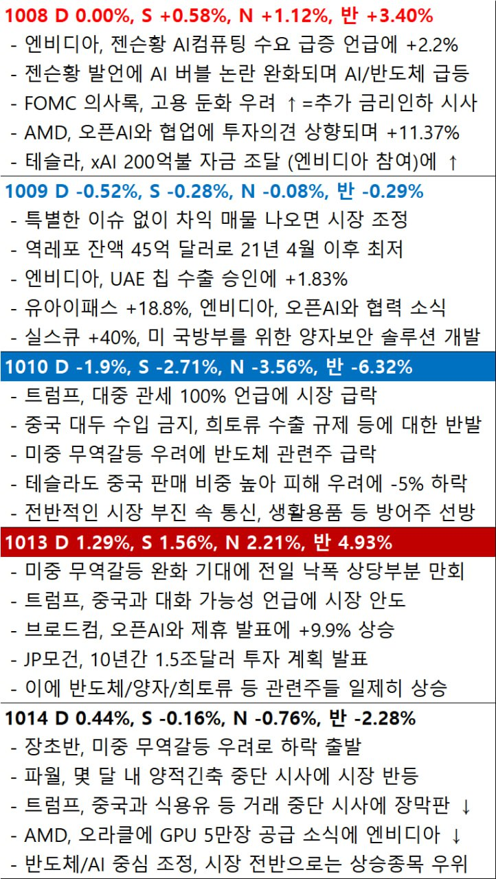 - 더불어 서브프라임 대출 시장의 신용 문제에 대해 경고하며 업계의 잠재적 리스크를 언급. 블랙록의 래리 핑크 CEO는 AI에 대한 국가적 대규모 투자를 촉구하는 동시에 시장 내 AI 버블 가능성을 언급.