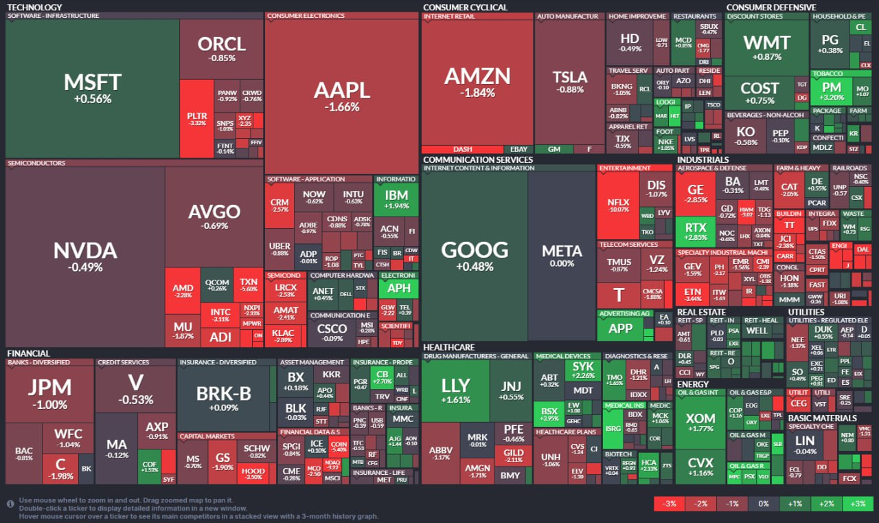 - 넷플릭스 $NFLX 실적 발표 후 급락과 함께 하락 출발한 시장은 장 중반 트럼프 행정부가 미국산 소프트웨어를 사용한 전세계 모든 제품에 대한 중국 수출 제재를 고려중이라는 보도가 나오자 낙폭 확대. 이후 장 후반 낙폭 일정 부분 회복하며 마감