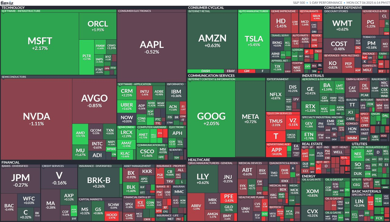- 오픈AI 개발자 컨퍼런스에서 AMD $AMD 와의 빅딜 발표하며 AMD 23% 급등. 엔비디아 $NVDA 와 브로드컴 $AVGO 제외 반도체 업종 강세. AI 관련주 내에서도 앞서나간 종목들이 주춤하는 사이 뒤쳐진 종목들이 따라오는 순환매가 나타나고 있음
