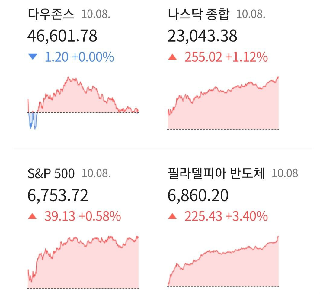 - NASDAQ +1.11%(23,040.94), 다우 +0.03%(46,617.10) 마감.
