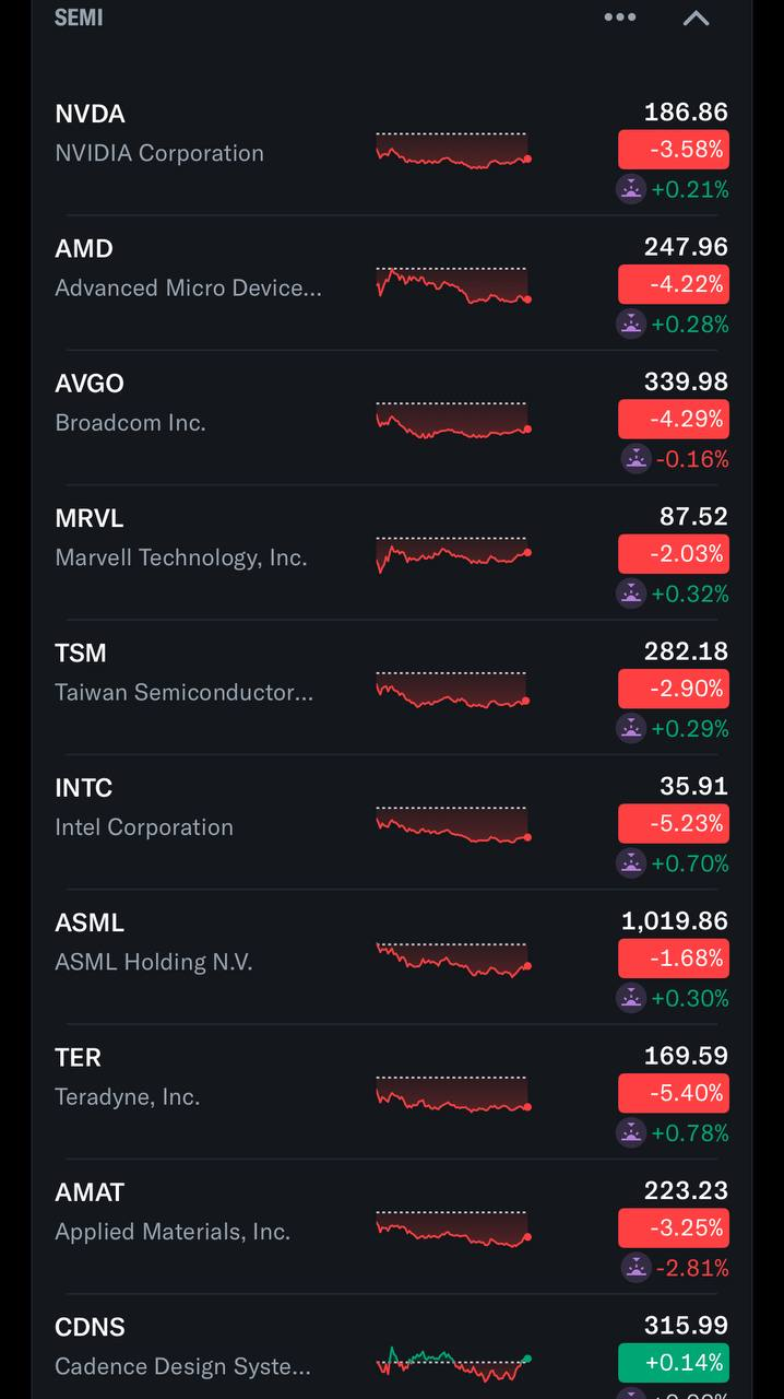 - 브로드컴(-4.29%), AMD(-4.23%)를 비롯해 램리서치(-5.02%), ARM(-5.67%) 등 대부분 반도체 기업들도 동반 하락.