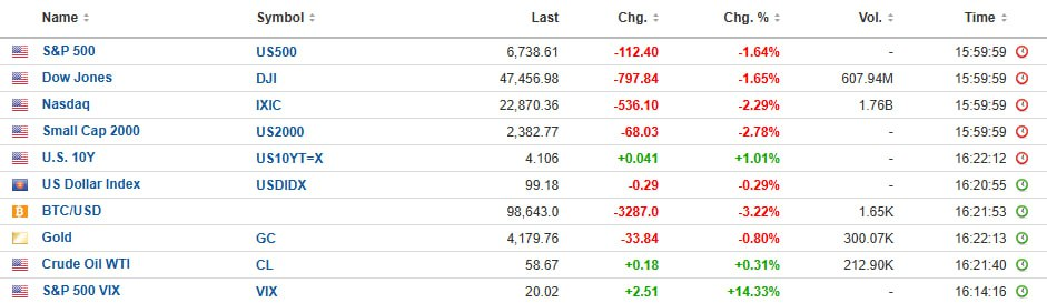 - 리테일 인기주 전반적 급락: TSLA -7.5%, DIS -7.6%, COIN -6.8% 등.