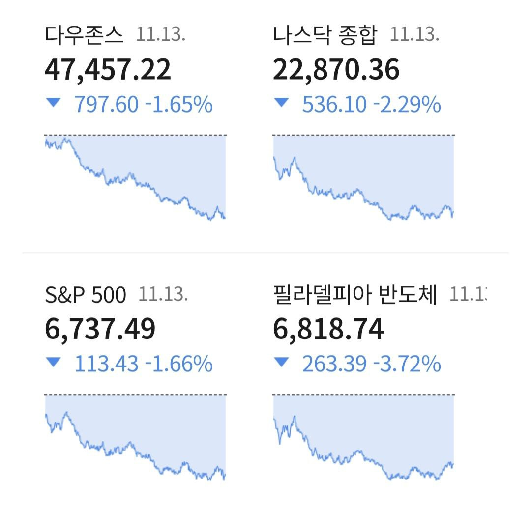 - 셧다운 종료라는 호재는 이미 시장에 상당 부분 반영된 반면, AI 버블 우려와 금리 불확실성이 단기 리스크로 부각되며 기술주 중심의 하락 압력이 크게 작용했습니다.