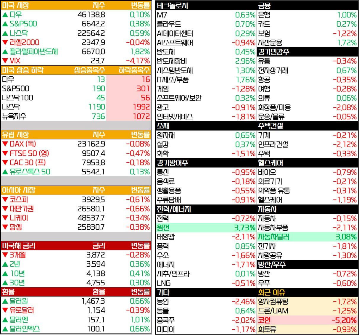 - 섹터별로는 경기 민감 섹터 강세, 성장 섹터 혼조, 경기 방어 섹터 약세