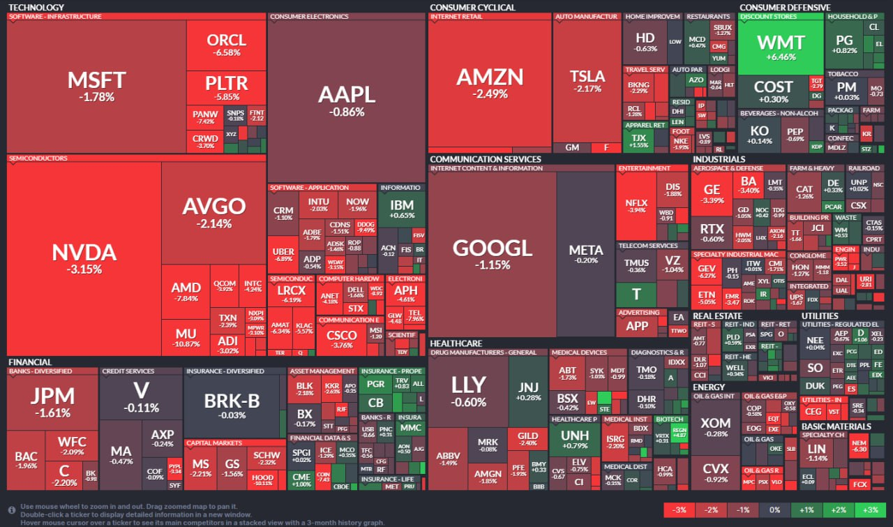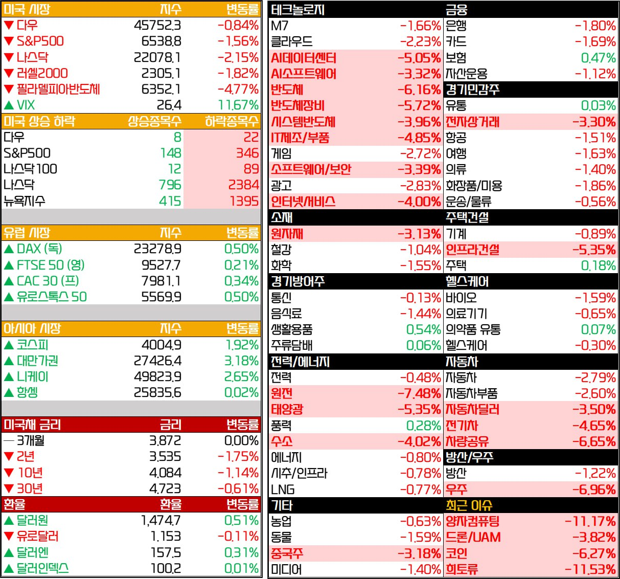 - 램리서치(-6.19%), AMAT(-6.15%) 등 반도체 장비 업종, 슈퍼마이크로 컴퓨터(-6.43%), 코어위브(-7.62%) 등 데이터센터 관련 기업들, 유아이패스(-5.56%), C3AI(-5.10%), 팔라다인AI(-2.06%) 등 AI 서비스 관련 기업들도 대부분 매물 출회되며 하락.