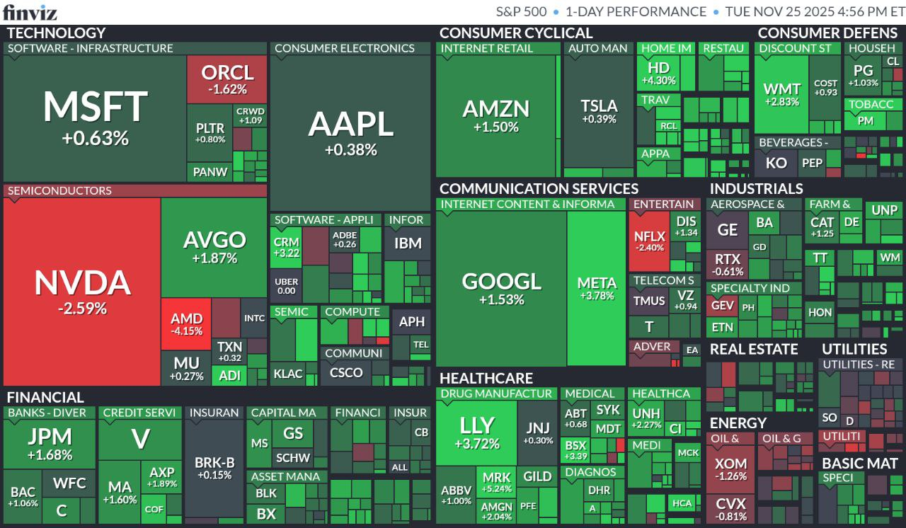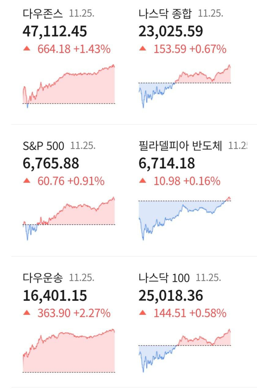 - 오라클(-1.62%)은 OpenAI의 ChatGPT의 강한 경쟁자로 제미나이 3.0이 부각되자 하락. 이는 오라클-OpenAI-소프트뱅크의 스타게이트 프로젝트에 대한 불안, 자본 수익화와 효율성 불안 등도 부담.