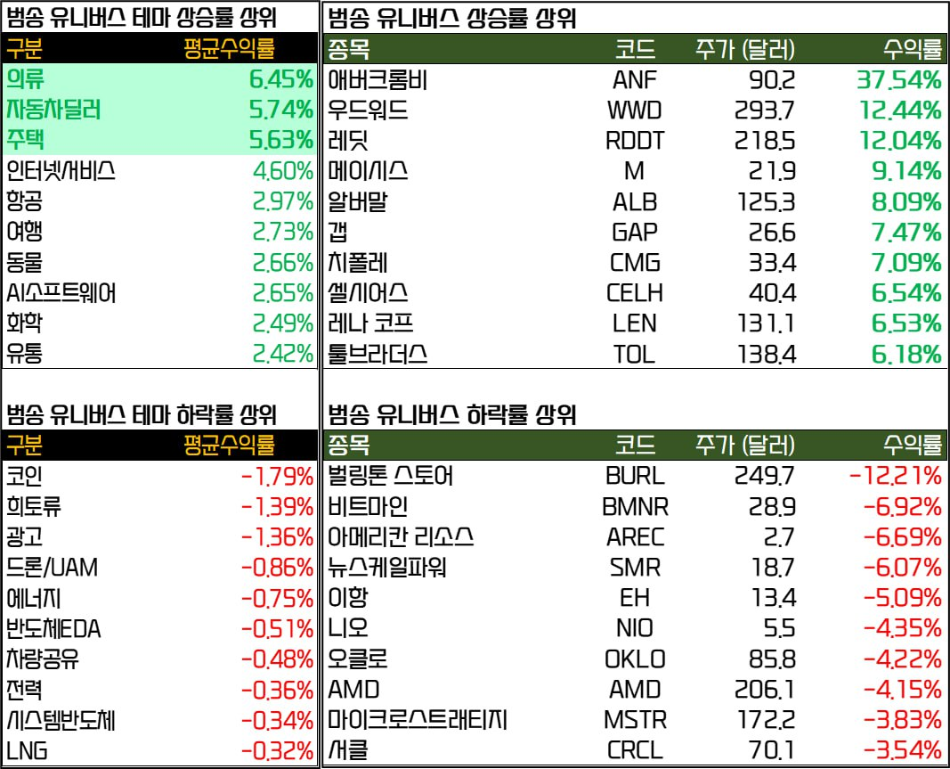 - 카맥스(+5.33%), 카르바나(+6.14%), 허츠 글로벌(+3.54%) 등 중고차 기업들도 금리인하 기대 속 상승.