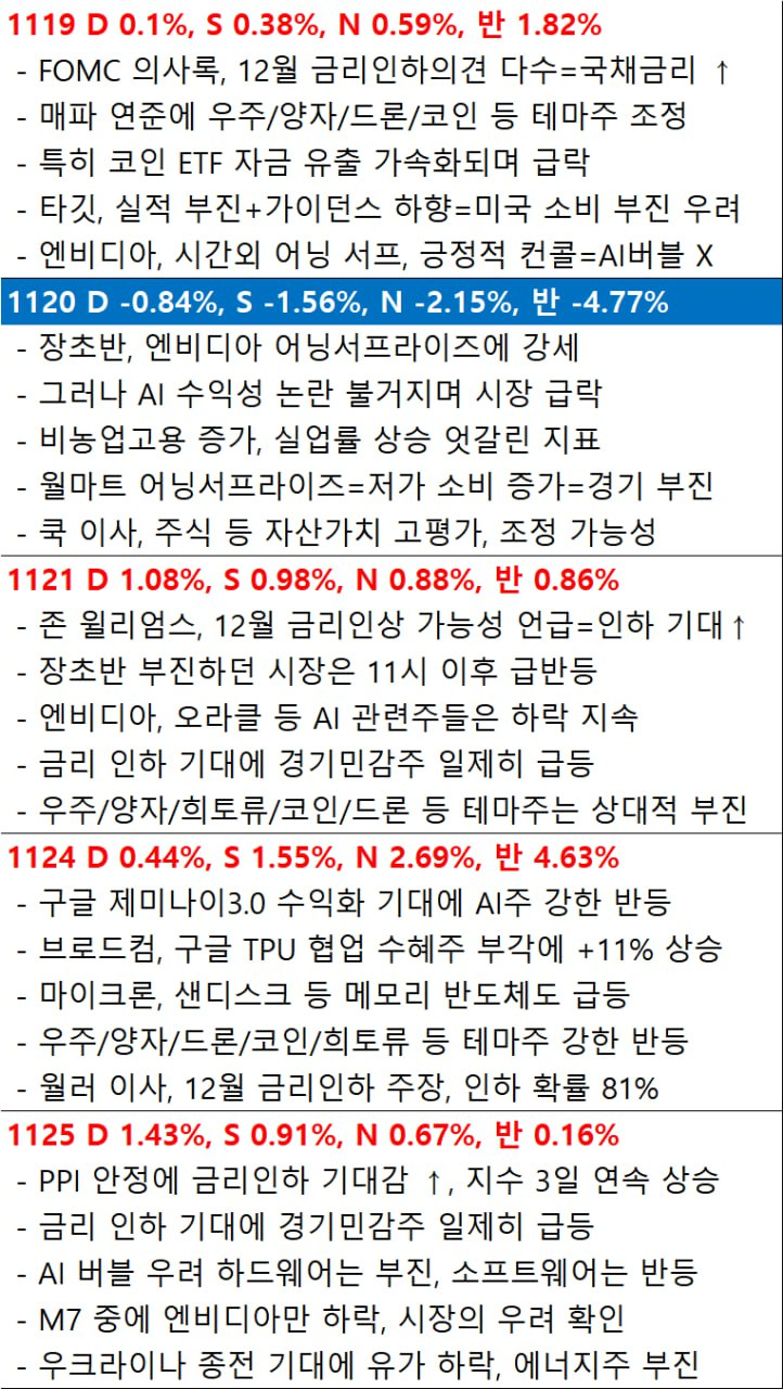 - 장 초반 엔비디아(-2.59%)가 7.1%, AMD(-4.14%)가 9.7% 급락. 구글이 제미나이 3.0을 자체 칩을 이용해 양호한 결과를 내놓자 경쟁 심화 여파가 영향.