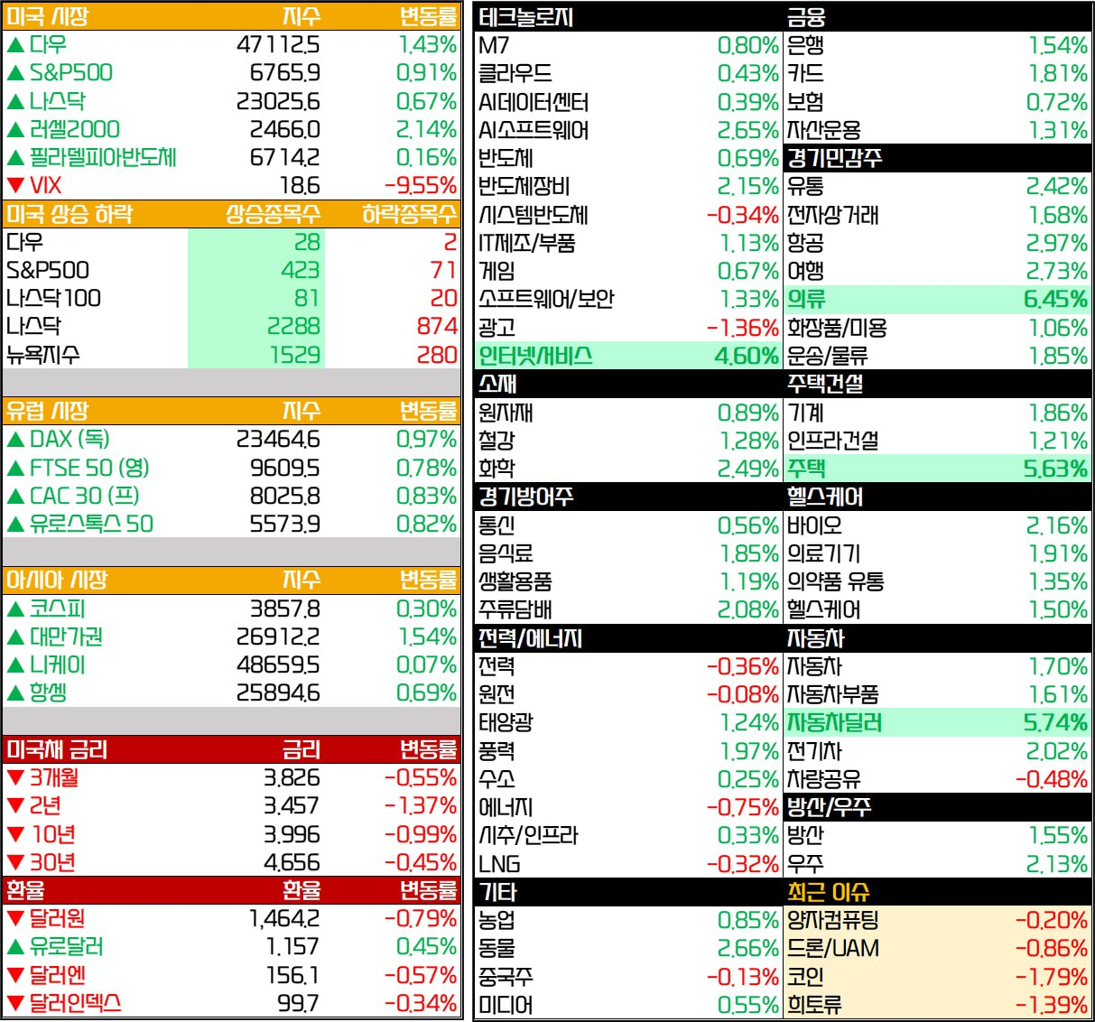 - 미국 시장은 연준의 금리인하 기대 지속되며 상승 마감.
