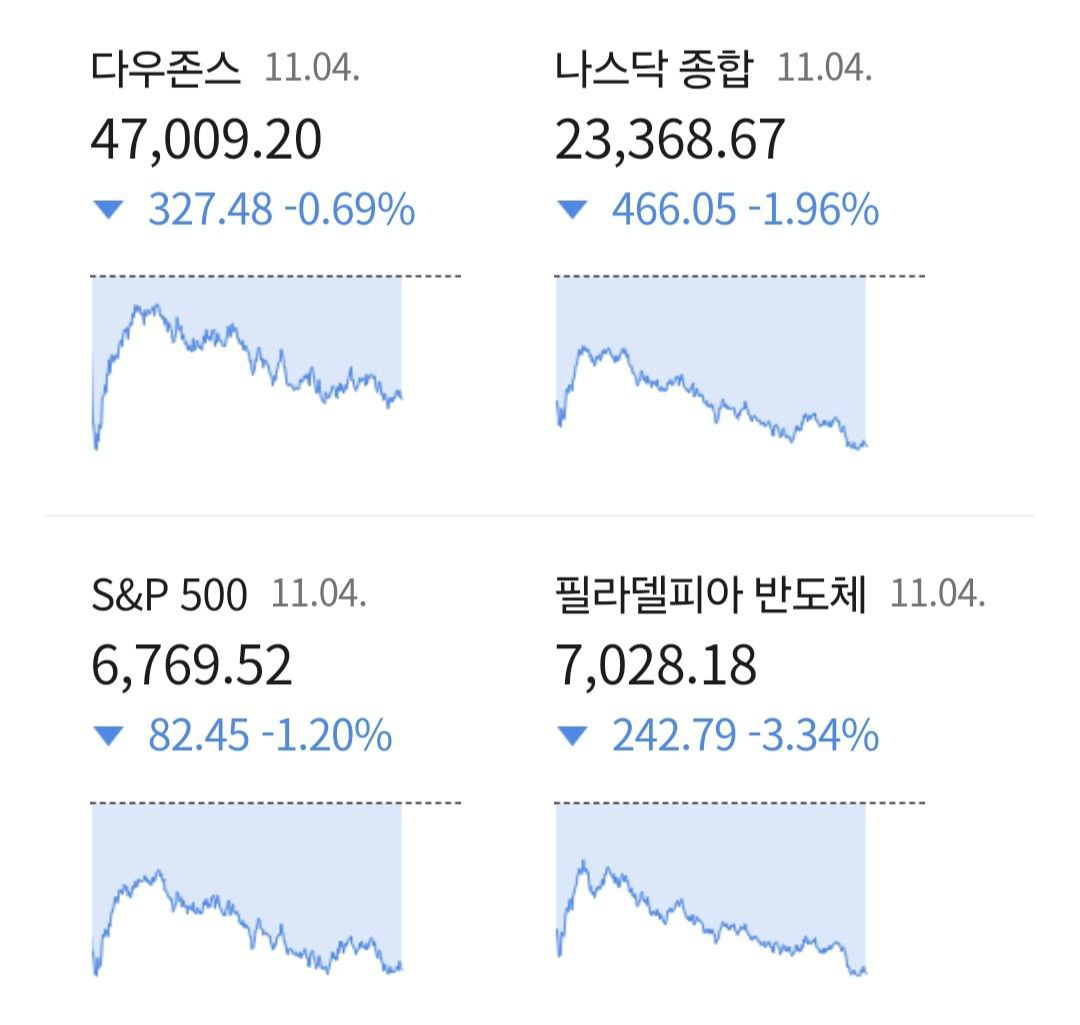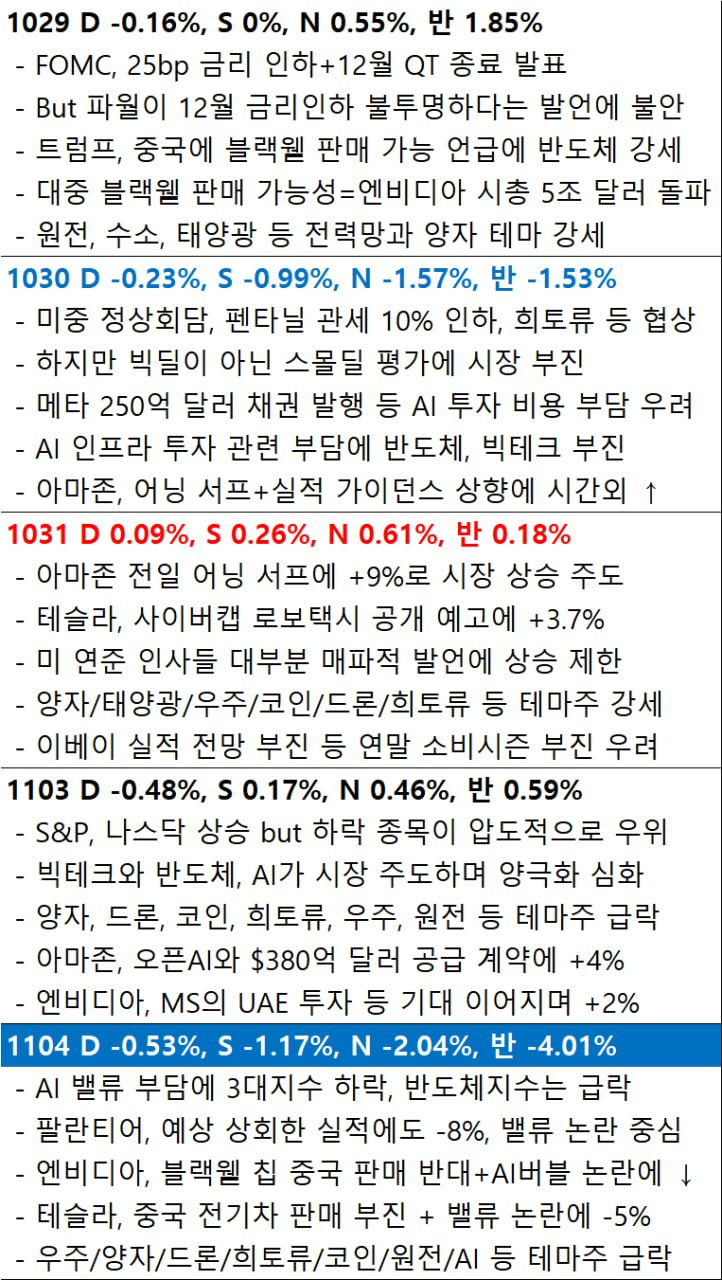 - 오늘 지수 변화에서 보여주듯 기술주의 밸류에이션 불안은 지수 전반의 하락 압력으로 쉽게 전이되며, 이는 연준의 12월 금리 인하 불확실성 등 매크로 요인과 결합되어 시장의 경계감을 확대.