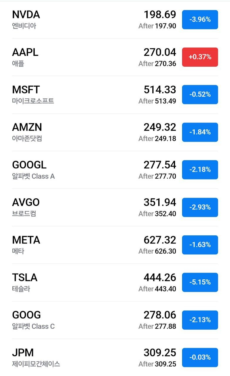 - 1조달러급 빅테크는 애플을 제외하고 하락, 브로드컴·알파벳·아마존이 약 2% 밀렸습니다.