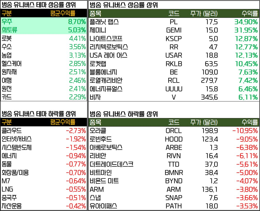 - 로켓랩(+10.45%), 인튜이티브 머신(+6.09%), 파이어플라이 에어로스페이스(+10.38%) 등은 스페이스X 상장 기대가 이어지며 전일에 이어 상승 지속.