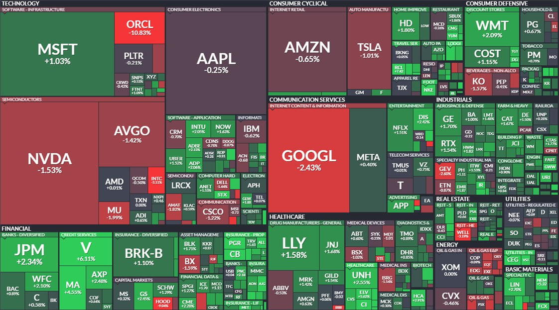 *특징 종목: 오라클, 엔비디아, 알파벳 부진 Vs. 비자, 일라이릴리, 유나이드 헬스 상승