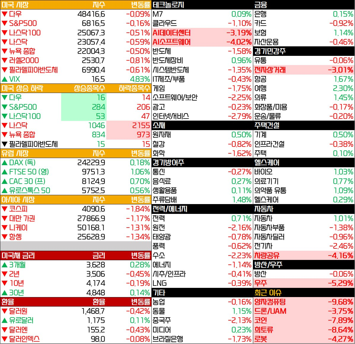 - 샌디스크(-2.09%)도 부진. 사이퍼 마이닝(-13.55%), 아이렌(-11.59%), 코어위브(-7.94%) 등 네오 클라우드 관련 기업들은 비트코인 하락과 재무 불안 요인이 있는 소기업들에 대한 투자 심리 위축 여파로 하락.