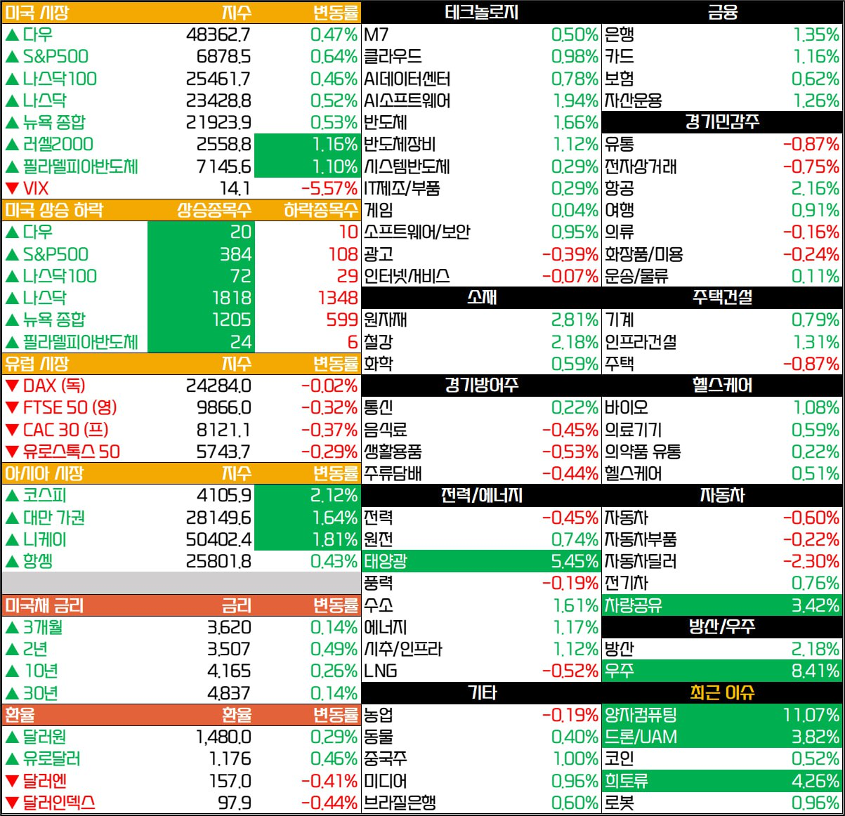 • 엔비디아(+1.49%)는 내년 2월부터 중국으로 H200 수출할 것이라는 소식이 알려지자 상승. 관련 소식에 TSMC(+1.50%) 등 관련 기업들도 동반 상승.