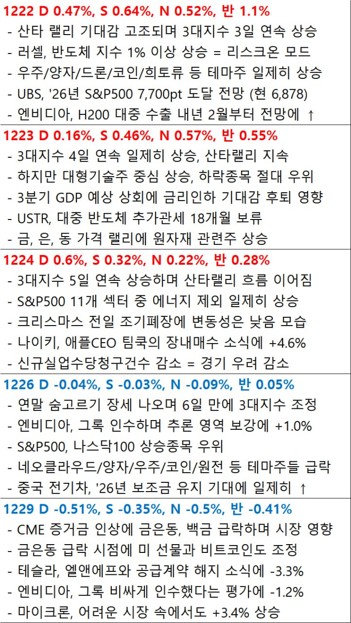 - 미국 주식 시장은 연말 저유동성 속 사상 최고치에서 소폭 조정, 연준 금리 인하 기대에 달러 약세, 국채 금리 하락.
