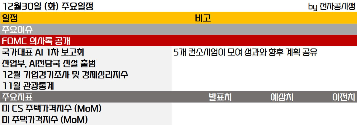 - AI 관련주 전반적으로 연말 차익실현과 밸류에이션 부담으로 조정 압력 확대.