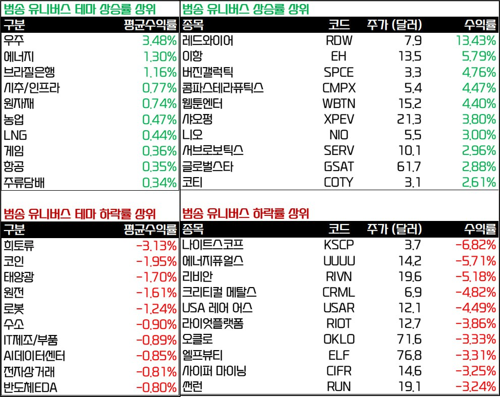 - 레드와이어(+13.43%), AST스페이스 모바일(+4.49%)등도 강세