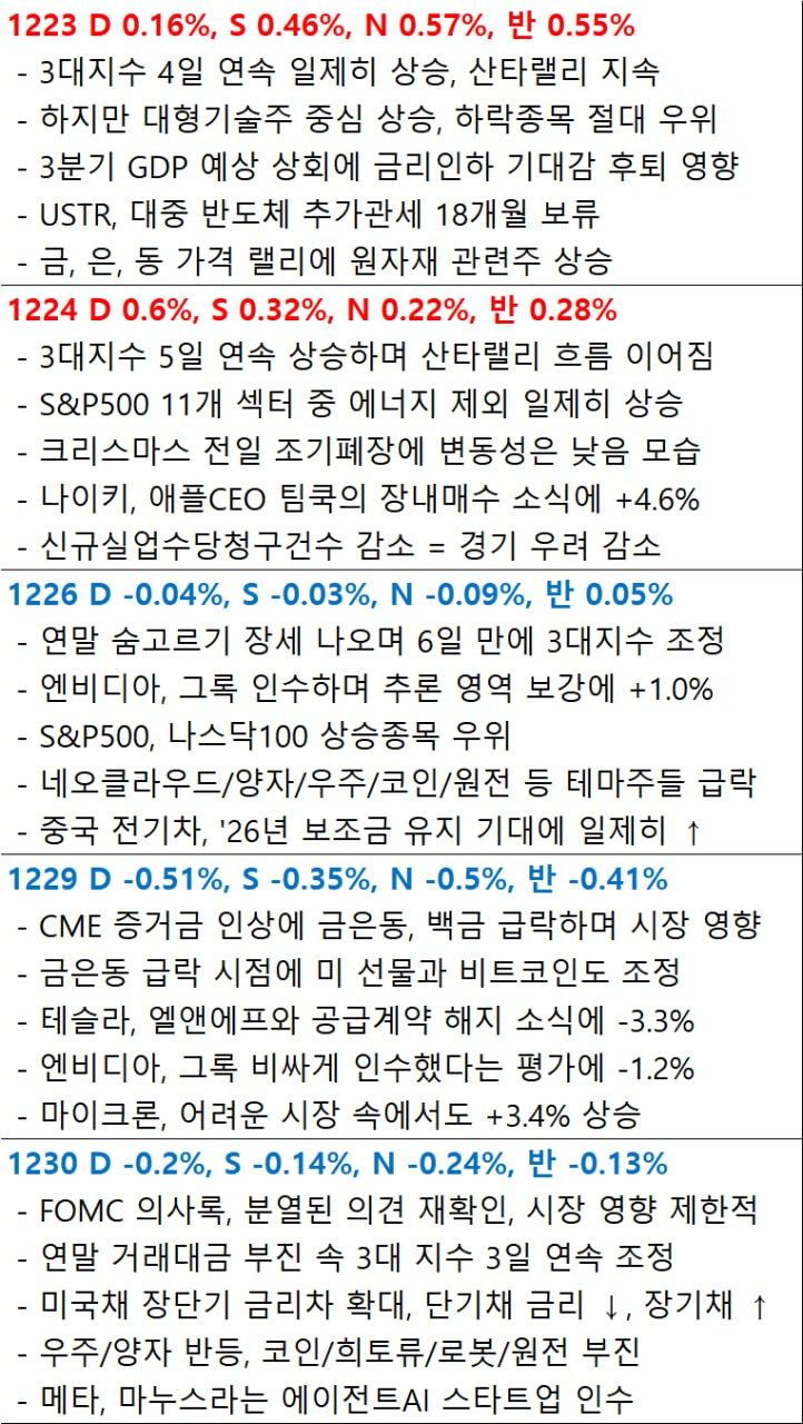 - 엔비디아(-0.36%)는 추론형 칩 기업인 Groq 인수와 관련 긍정적/부정적 요인이 여전히 반영되며 소폭 하락하기도 했음.