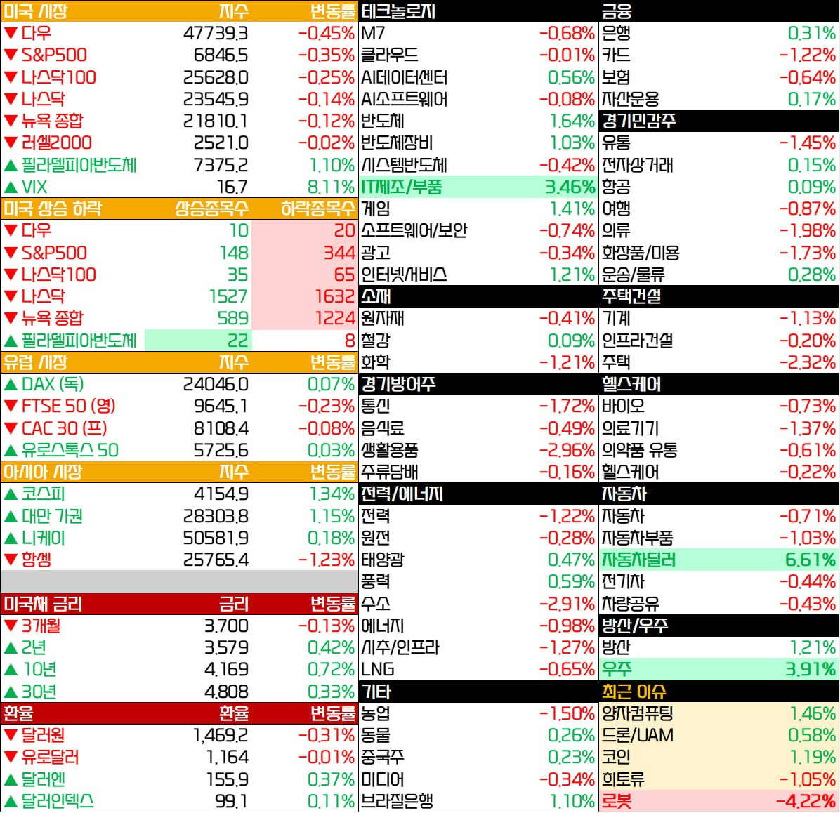 - 팔란티어(-0.15%)는 CEO의 대규모 주식 매도 소식과 풋옵션 거래 급증 등 수급 불안 요인으로 하락.