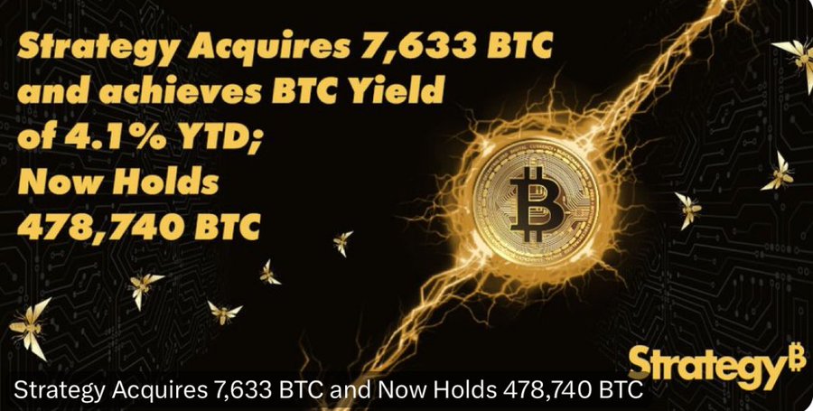 - mstr이 7억 4,240만 달러에 7,633개의 BTC를 매수했습니다.btc 합계 478,740