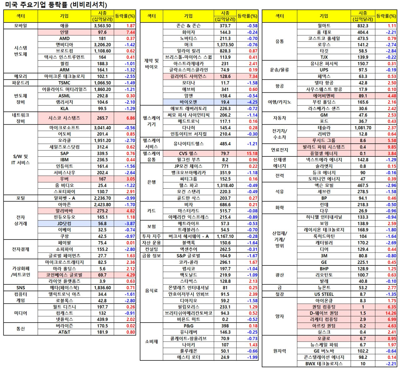 - CVS헬스(+14.95%)는 예상을 상회한 실적 등을 바탕으로 급등.