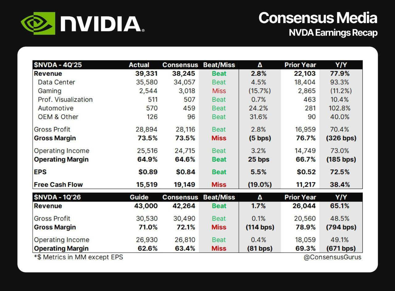 - 엔비디아가 지난해 4분기 실적 발표에서 매출 393.3억 달러(예상 380.4억 달러), 순이익 220.9억 달러(예상 196.1억 달러)를 기록했다고 밝혔다.