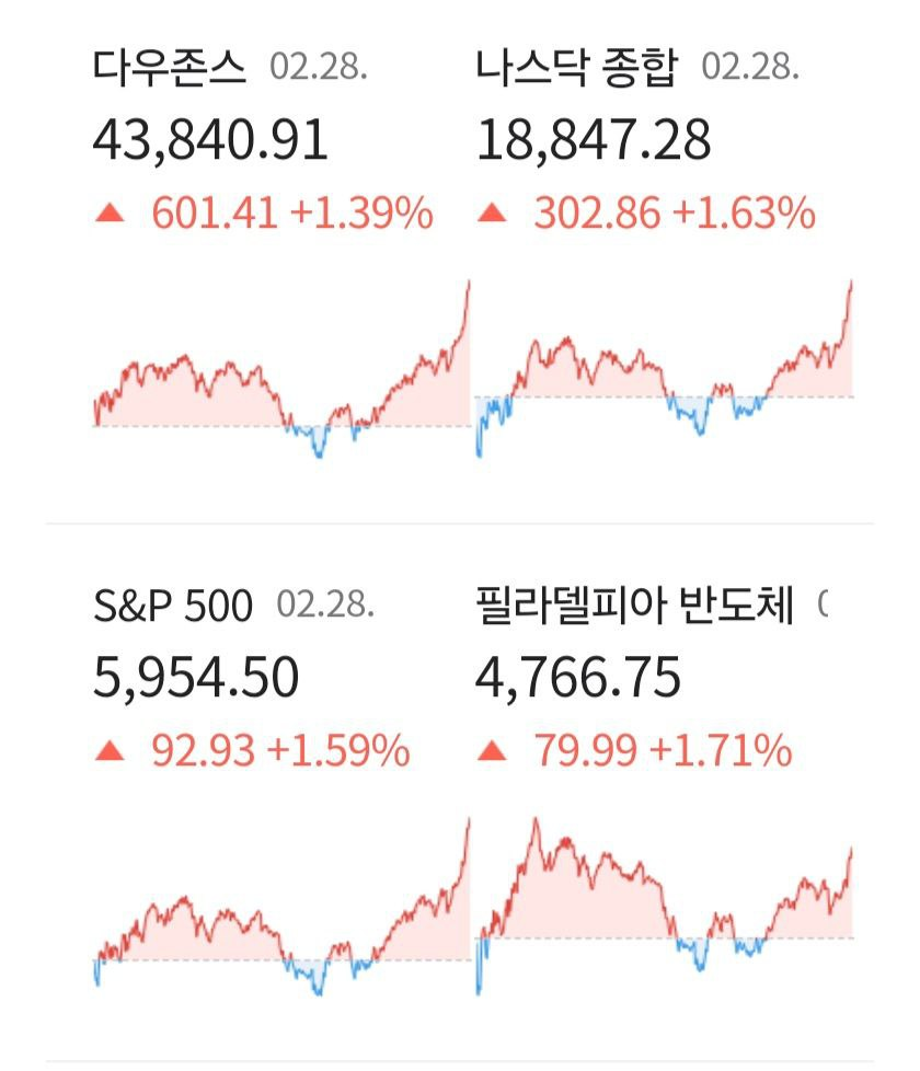 - 미국증시는 트럼프 미국 대통령과 젤렌스키 우크라이나 대통령의 정상회담에서의 설전으로 지정학적 위험이 커졌다는 우려로 하락세를 보였으나 장 마감이 가까워지면서 급등.