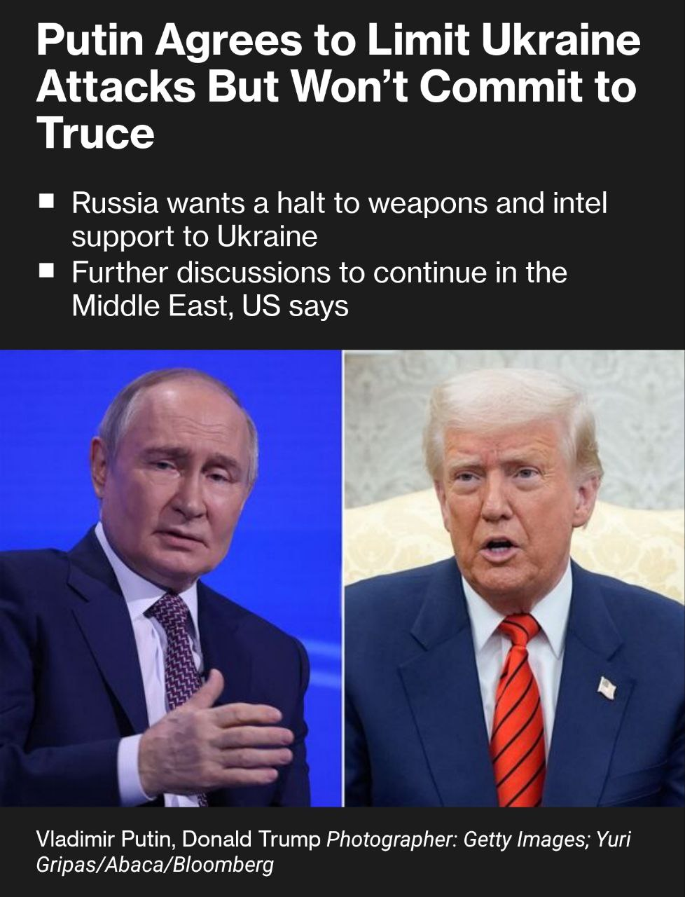 - » 푸틴-트럼프 전화 통화 이후 러시아는 우크라이나의 에너지 시설에 대한 공격을 중단하는 데 동의했으나, 당장 미국이 요청한 30일간의 휴전에는 동의하지 않음