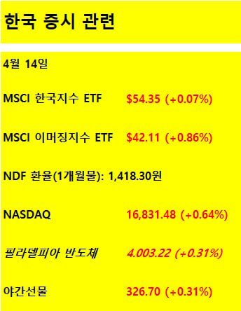 - 트럼프 행정부가 스마트폰과 컴퓨터 등 일부 전자제품에 대한 관세를 유예할 것으로 알려지며 애플을 비롯한 기술주들이 강세를 보임.