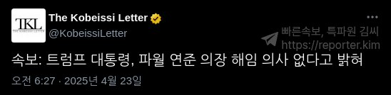 - 외신에 따르면 도널드 트럼프 미국 대통령이 “제롬 파월 미국 연준 의장을 해임할 생각(No Intention)은 없다”고 말했다.