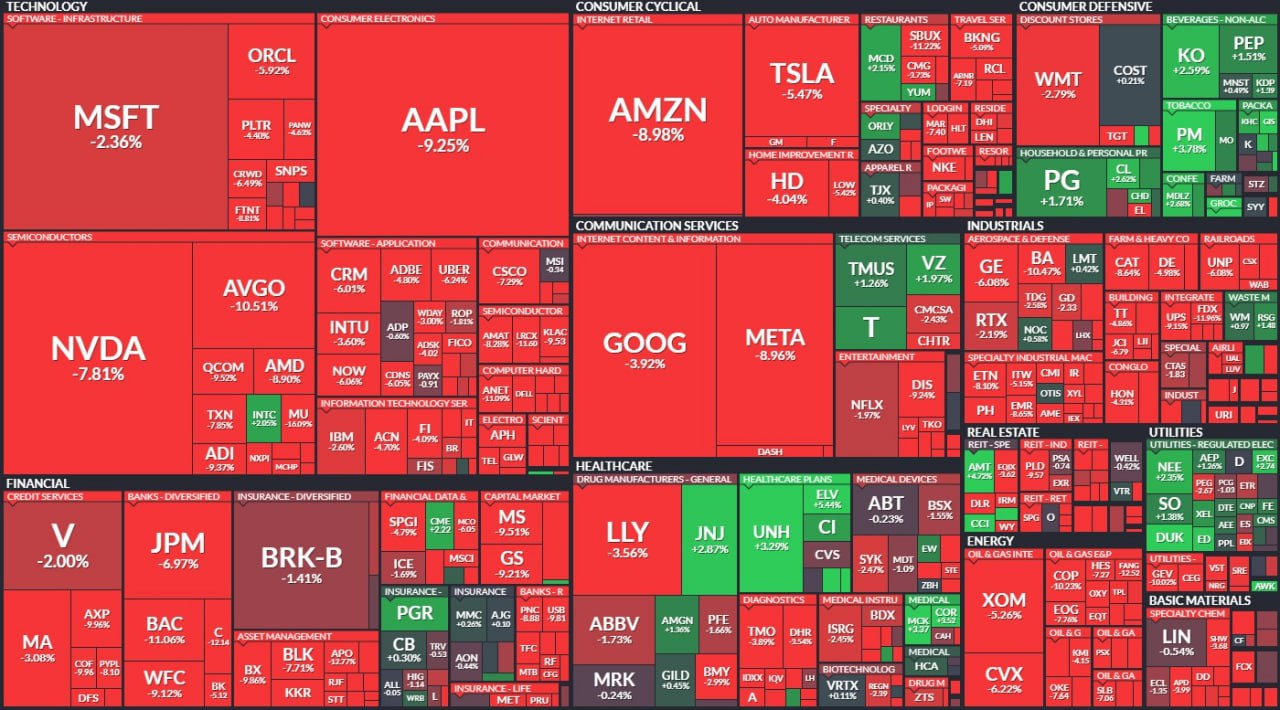 - 기술주 역시 -5% 넘는 하락세를 보였는데 중국 노출도가 크고, 높은 관세가 부과될 베트남 진출 계획 영향으로 애플이 -9.25% 폭락했습니다