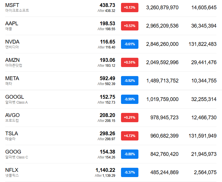 - 텍사스 인스트루먼트(+4.00%)는 브리븐 하워드 캐피탈 등 일부 기관 투자자들의 대량 매입 소식과 미-중 완화 기대를 반영하며 상승.