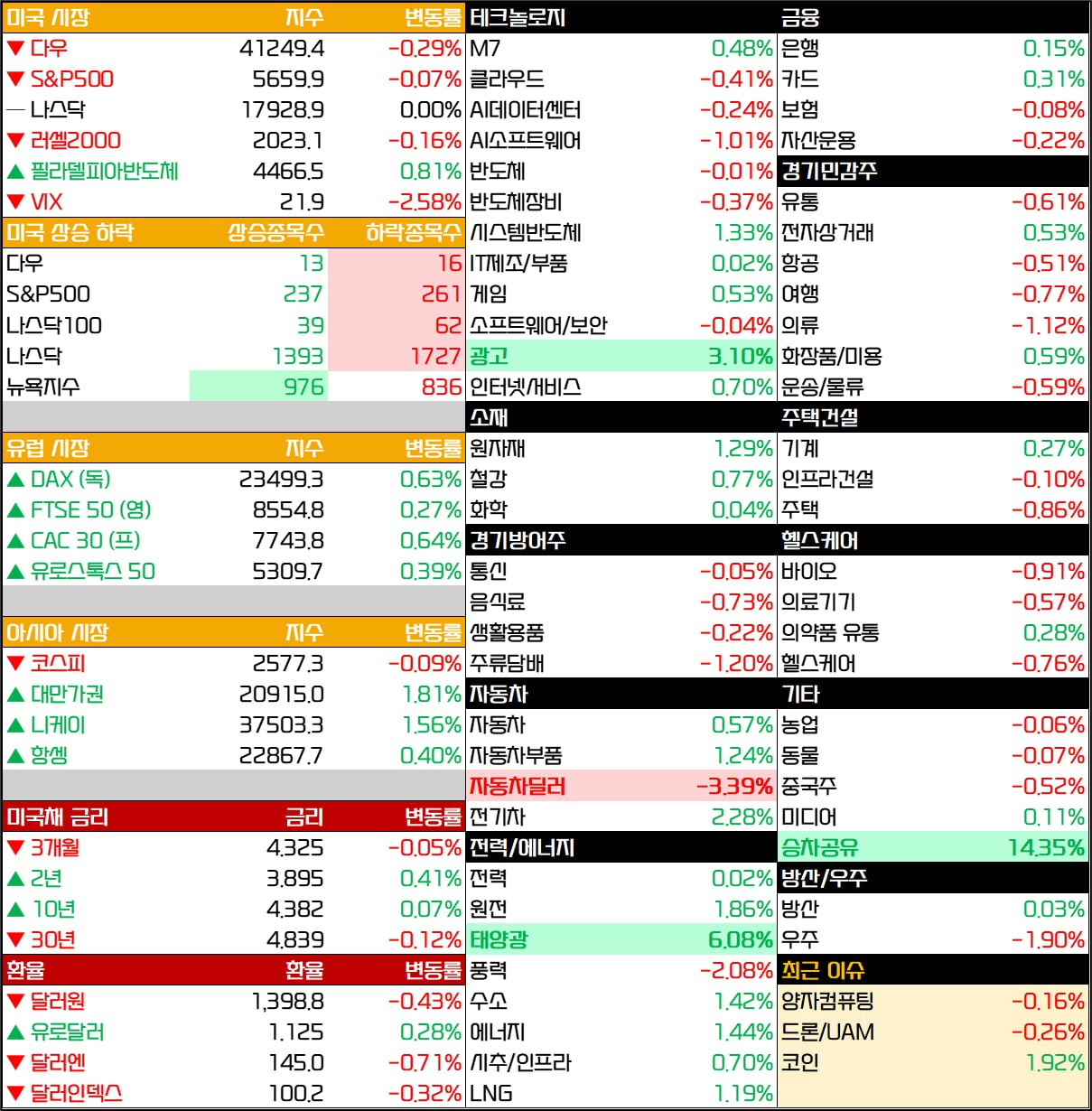 - 일라이릴리(-2.25%), 암젠(-2.28%), 머크(-2.16%), 화이자(-1.15%)등 제약업종은 트럼프의 의약품 관세 부과, 약가 인하 발표 등을 앞두고 하락 지속.