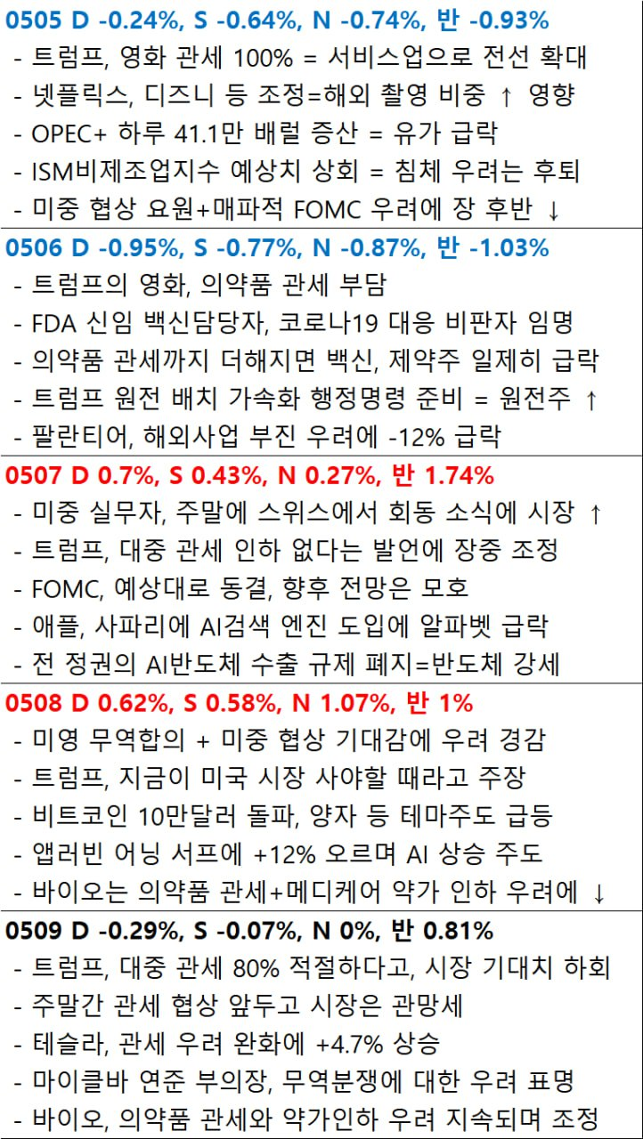 - 시장의 낙관론이 강하게 이어지고 있지만 영국과의 협상처럼 합의가 되도 10%의 관세가 유지될 것이라는 점과 합의까지 상당한 시일과 레토릭이 난무할 것이란 점을 감안하면 지금부터 투자자들은 시장에 조심히 접근해야 할 것입니다