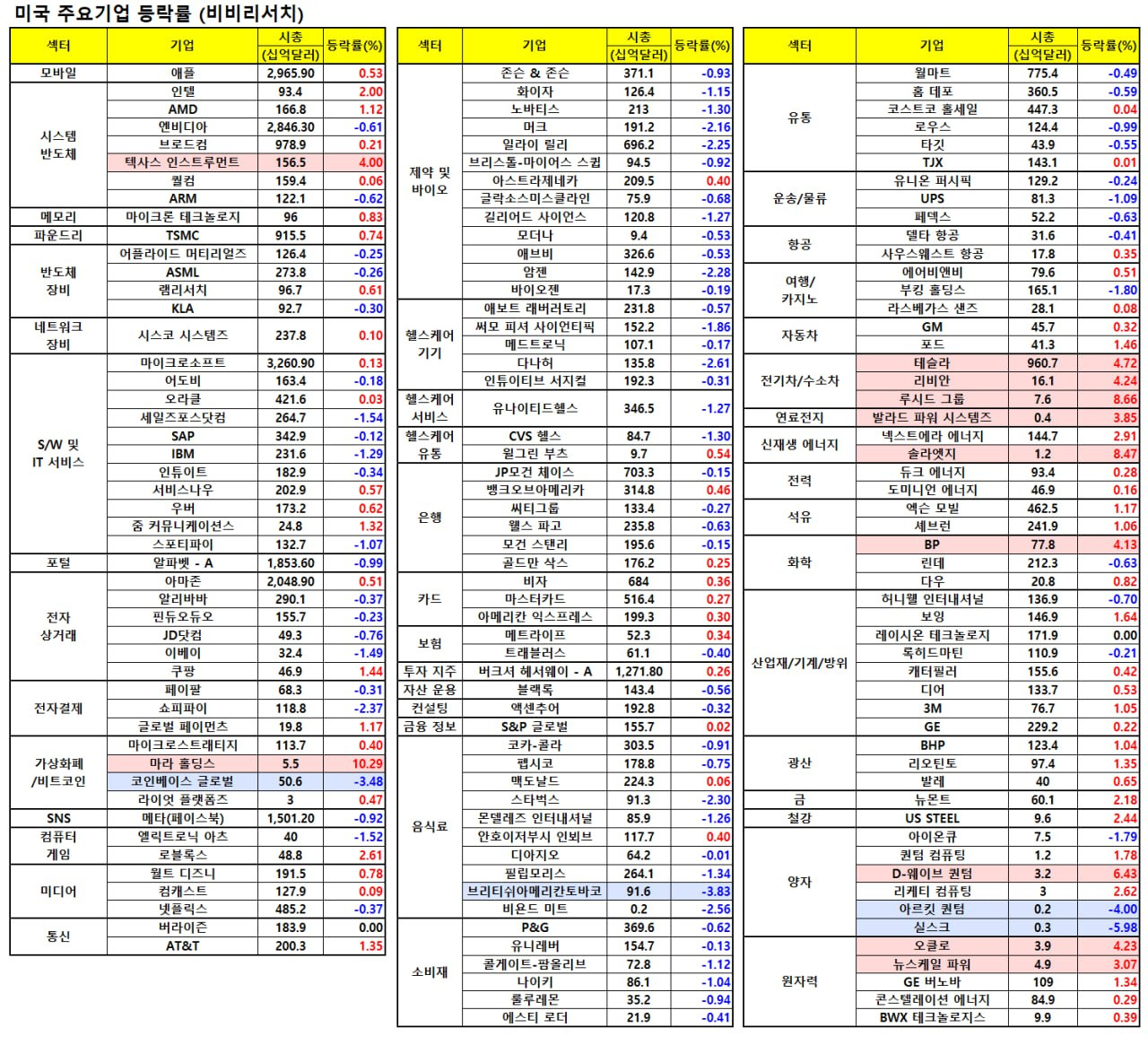 지난밤 미국 주요 종목 동향 (시간외 반영)