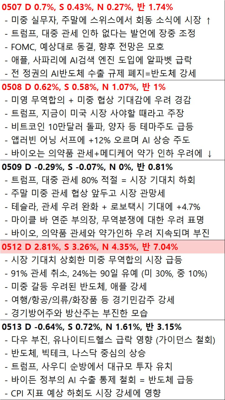 - 이런 가운데 이번 트럼프의 중동 방문에 동반한 엔비디아(+5.63%), 테슬라(+4.93%), 팔란티어(+8.14%), OpenAI등 많은 기업들이 '사우디-미국 투자 포럼'을 통해 자사의 기술을 선보이고 사우디 등의 투자를 반영하며 강세를 보이자 주식시장에 긍정적인 영향.