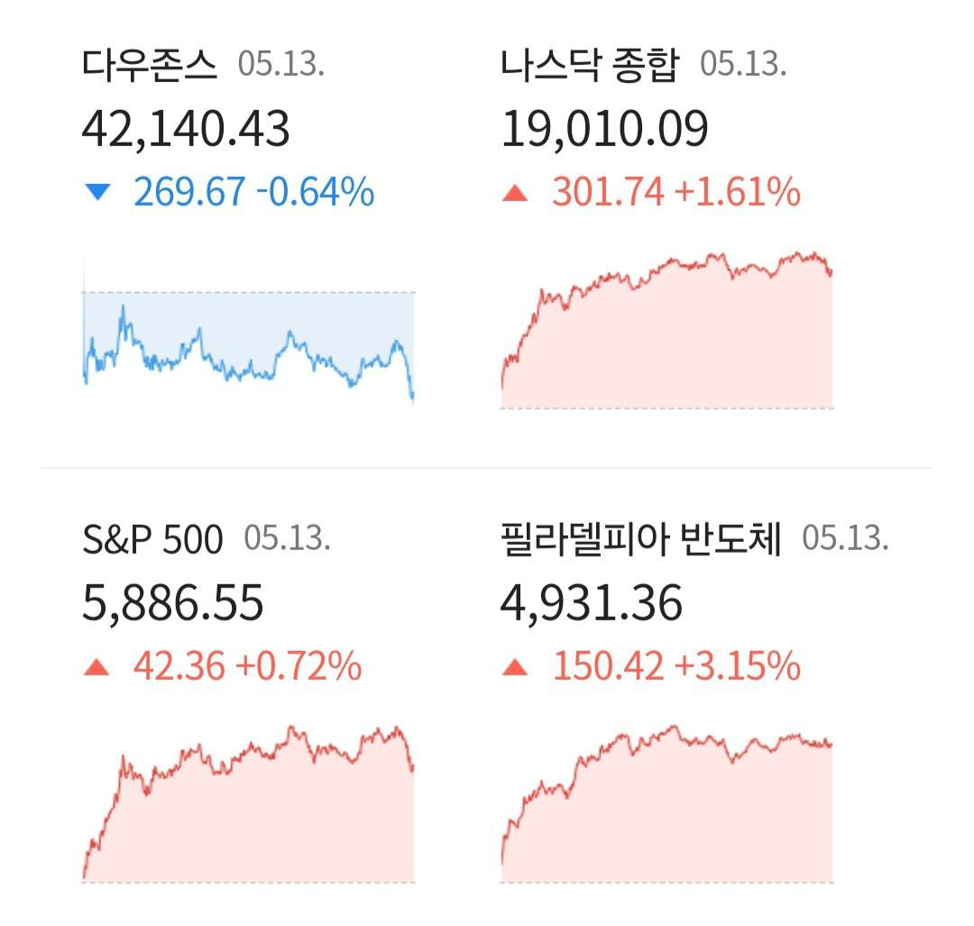 - 05/14 나스닥, 중동 방문한 트럼프와 엔비디아 등 많은 기업들의 발표에 힘입어 상승