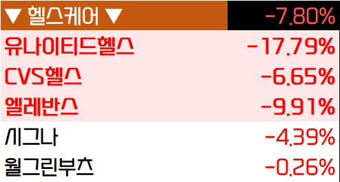 - CVS헬스(-6.65%), 엘리번스(-9.91%), 휴마나(-9.48%)등 관련 기업들도 동반 하락.