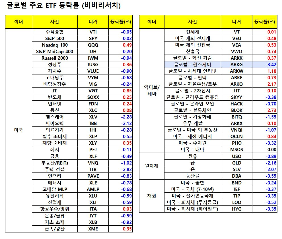 - 국채금리가 상승하며 주택관련 기업들이 부진한 흐름을 보였고 헬스케어 역시 약세 흐름을 이어갔습니다.