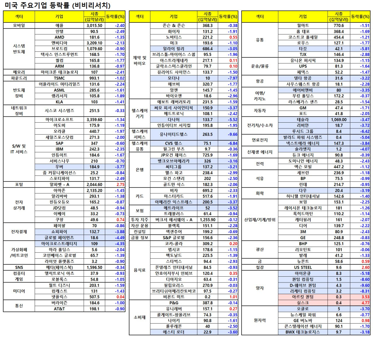 지난밤 미국 주요 종목 동향 (시간외 반영)