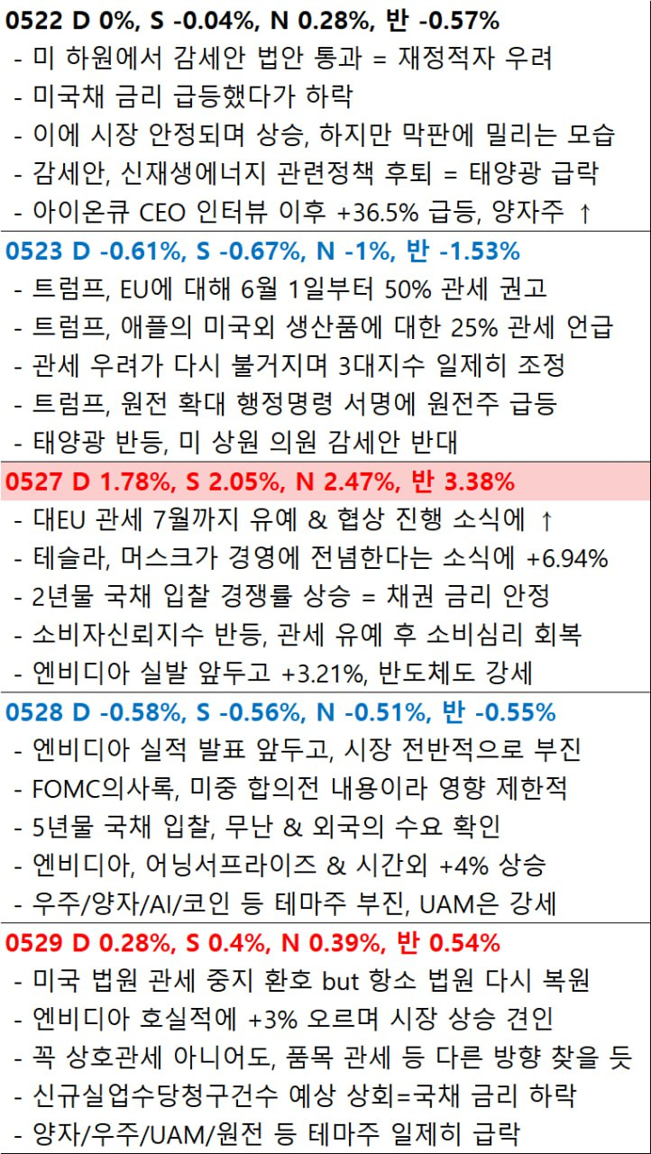 - 미 증시는 엔비디아(+3.25%)의 실적 발표 후 강세와 트럼프 관세 관련 법원 판결에 힘입어 상승 출발.